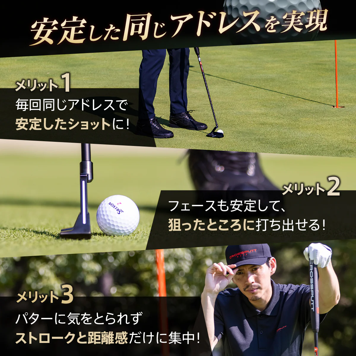 CROSSPUTTの新モデルパター CP-400 は、縦ラインと逆三角ネック構造により、構えた瞬間からフェースの向きが視覚的にわかり、